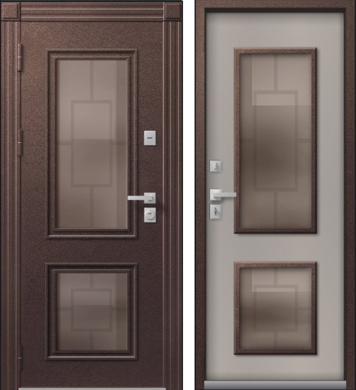В конструкции двери Т-1 PREMIUM используется двухкамерный стеклопакет толщиной 48 мм, цвет Бронза с низкоэмиссионным энергосберегающим покрытием, сохраняющим тепло внутри дома. С внешней части стеклопакета установлена декоративная металлическая решетка. Эта дверь станет украшением Вашего дома